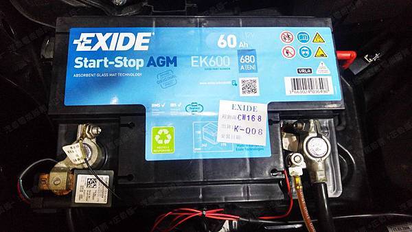 更換汽車電池為 EXIDE埃克塞德 法製 AGM EK600 容量60AH 冷啟動電流680A(EN)