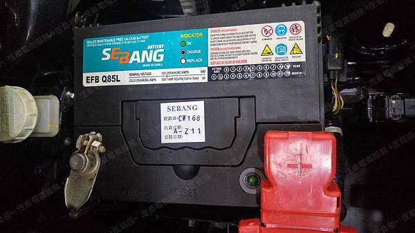 更換汽車電池為 SEBANG世邦 韓製 EFB Q85L 容量65AH 冷啟動電流700A