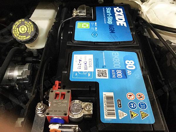 更換汽車電池為 EXIDE埃克塞德 法製 AGM EK800 容量80AH 冷啟動電流800A(EN)