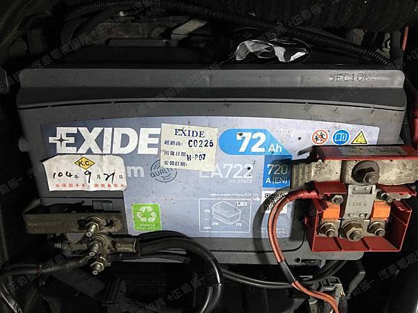 原裝汽車電池為 EXIDE埃克塞德 法製 碳合金 EA722 容量72AH 冷啟動電流720A(EN)