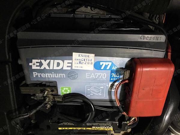 更換汽車電池為 EXIDE埃克塞德 法製 碳合金 EA770 容量77AH 冷啟動電流760A(EN)