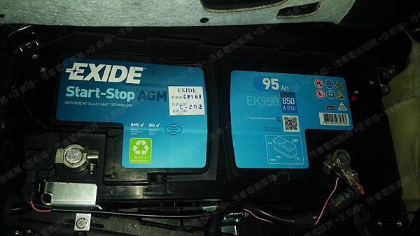 更換汽車電池為 EXIDE埃克塞德 法製 AGM EK950 容量95AH 冷啟動電流850A(EN)
