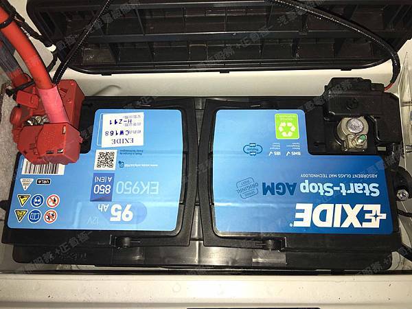 更換汽車電池為 EXIDE埃克塞德 法製 AGM EK950 容量95AH 冷啟動電流850A(EN)
