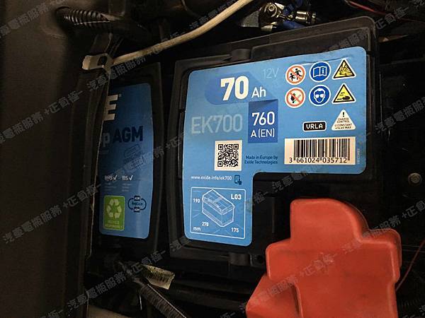 更換汽車電池為 EXIDE埃克塞德 法製 AGM EK800 容量70AH 冷啟動電流760A(EN)