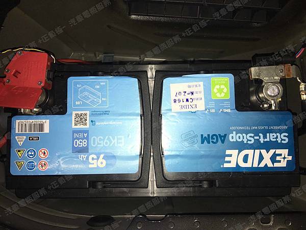 更換汽車電池為 EXIDE埃克塞德 法製 AGM EK950 容量95AH 冷啟動電流850A( EN)