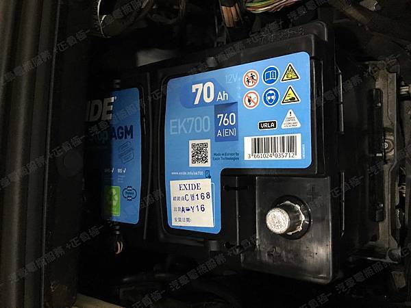 更換汽車電池為 EXIDE埃克塞德 法製 AGM EK700 容量70AH 冷啟動電流760A(EN)