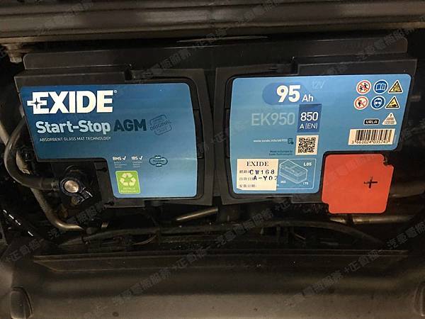 更換汽車電池為 EXIDE埃克塞德 法製 AGM EK950 容量95AH 冷啟動電流850A(EN)